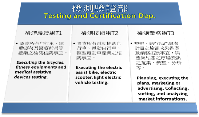 Testing and Certification Dep. of Cycling & Health Tech Industry R&D Center is only legal person (entity) achieve expertise in bicycle testing in Taiwan. The assessment of independence and impartiality is developed and free of any conflicts of interest. In addition, we cooperated with TÜV and DNV for years and also being the pilot list of granted laboratory accreditation by Taiwan Accreditation Foundation.